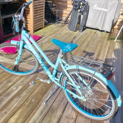 Barncykel med 24" hjul(tror jag) i silverfärg. Passar barn i ca 11 års åldern. Märke Crescent. Cykeln har rak ram, handbroms fram samt växlar som styrs från styret. Utrustad med reflexer och sadel anpassad för barn. Passar för barn som vuxit ur mindre barncyklar och behöver en cykel med större hjulstorlek för vardagscykling och fritid.