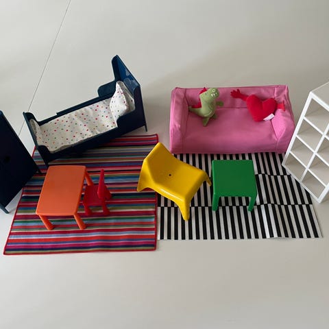 Ikea docksäng i trä med enkel ram och huvud- samt fotgavel. Sängen är avsedd för dockor eller gosedjur och står på fyra ben. Medföljer gör bäddset bestående av madrass eller dyna i blått samt täcke med rutmönstrat överdrag i flera färger. Passar för lek i barnrum och som inredningsdetalj i barnmiljö.