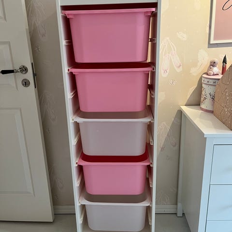 3 st hyllor med lådor (några har lock) och två hyllplan. Mått per hylla är 46x30x145 cm. Har skruvhål på sidorna då de varit fästa i varandra. Säljer helst alla tre i ett paket, 500 kr.