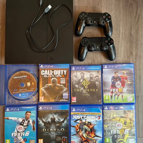 två trådlösa handkontroller och tillhörande kablar. En handkontroll är svart och en har kamouflagemönster. Medföljer även laddningsställ för handkontrollerna.