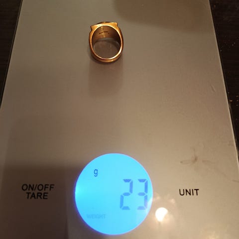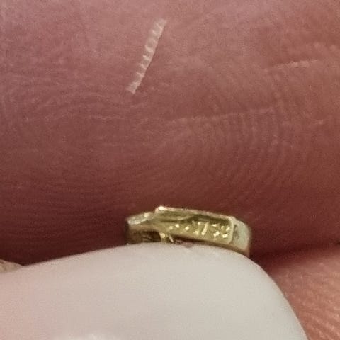 En liten stämpel finns på insidan (se bild). Metallen är inte testad som guld och säljs därför som roséfärgad metall / okänd metall. Väger ca 6gram, stl 18, så ej guld/ roséguld.
