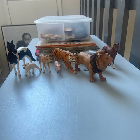 Dinosaurieleksaker figurset i plast med flera olika dinosauriearter i blandade färger och storlekar. Setet innehåller både större och mindre figurer samt ett dinosauriehuvud. Passar för lek, samlarintresse eller som dekoration i barnrum.