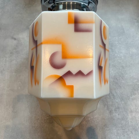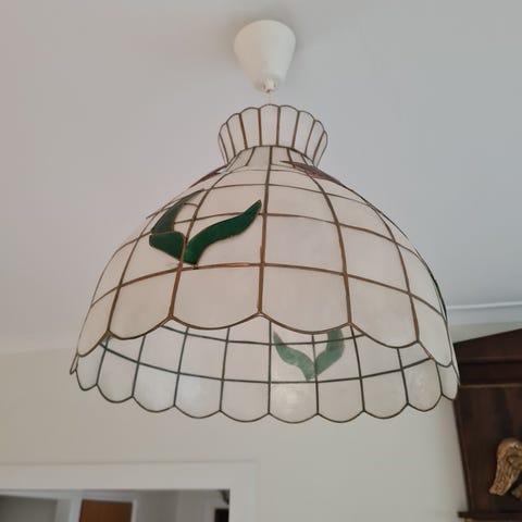 Vintage taklampa i opalglas med handmålad blomdekor – retro 50/60-tal