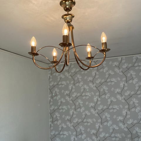 Charmig retro taklampa i vitt opalglas med handmålad blomdekor i rosa, grönt och guld. En klassisk modell från 1950–60-talet som ger ett mjukt och varmt ljus – perfekt i kök, hall eller som mysig belysning i ett retroinspirerat hem.