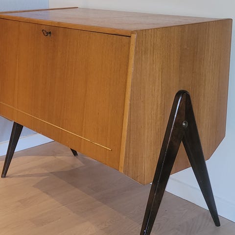 Mycket fin teakhylla med ett skåp och fem lådor. Finns även en utdragsskiva som kan användas som ett litet skrivbord. Hämtas på plats. Säljes pga flytt.