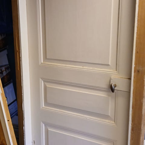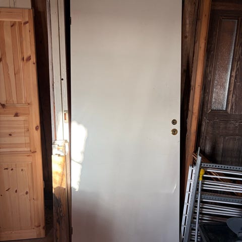 Ytterdörr vitmålad. Dörren är vänsterhängd och har måttet 100x210 cm enligt etikett. Utrustad med handtag och låscylinder. Passar som ytterdörr till bostad, förråd eller liknande utrymme där en enkel, slät ytterdörr behövs.