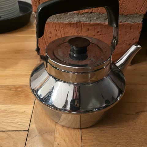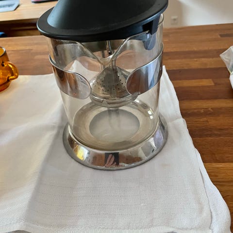 &Tradition tekanna i glas och metall med integrerad tesil i metall. Kannan har handtag och bottenplatta i metall samt lock i mörk plast. Lämplig för bryggning och servering av te. Passar i kök och matsal för vardagligt bruk eller servering vid bordet. The service, 5 koppar med fat i brun nyans, klassisk a the koppar från 70 talet. Pris: 150 kr för allt!