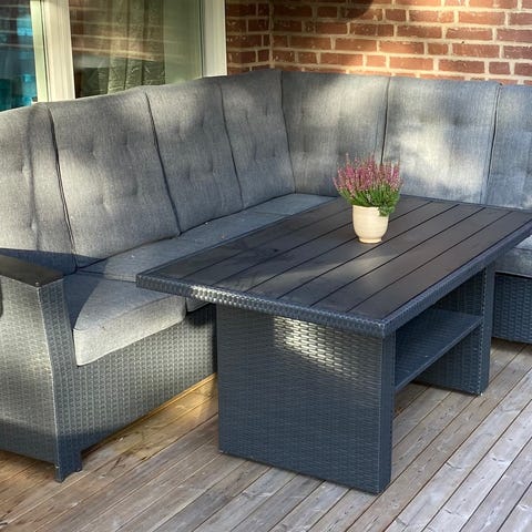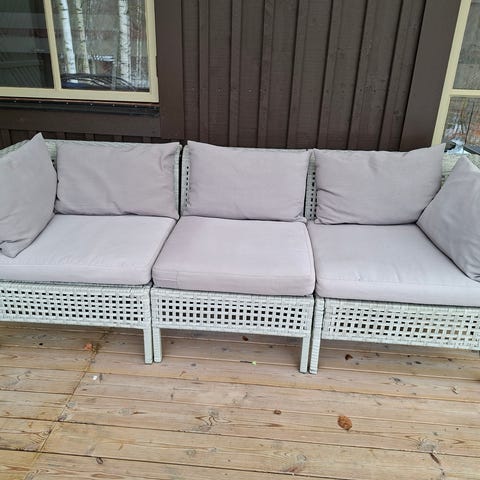Den är använd i tre somrar men är mycket fin. Inte sönder någonstans i rotting/stommen. Mitt på två dynor har trådarna släppt ( där man tror det ska sitta knappar). Inget som har någon betydelse men än utseende mässigt