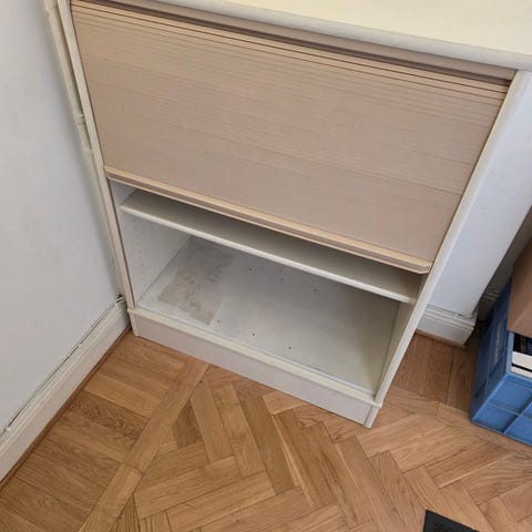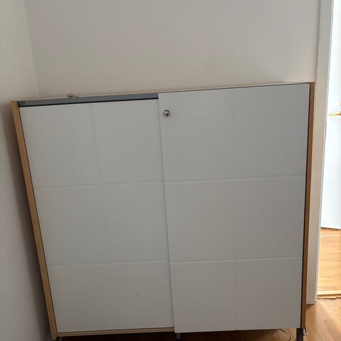 Förvaringsskåp med skjutdörrar i vitlaserat trä. Passar för kontorsförvaring av pärmar, mappar och annat kontorsmaterial. Står på ben. Finns 2 st. Priset är per skåp.