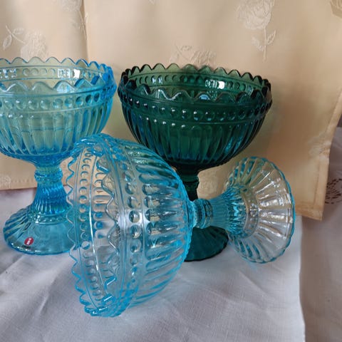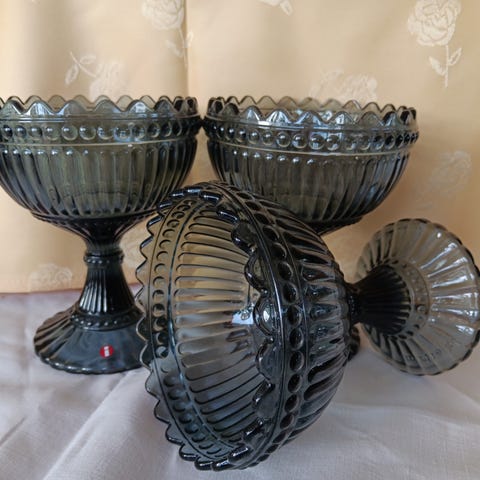 Jag säljer här 3 stora Iitala Marimekko glasskålar, två rökfärgat och en I blå. Skålar är 15cm högt och har en diamter av 12 cm. Detta tillhör dem stora varianten av Skålar. Dem blev aldrig använt hos oss och har som alla andra Marimekko skålar i mina annonser inget litet märke, helt felfritt. Titta gärna på mina andra annonser. Jag har 6 av dem Marimekko skålar till. Pris är 330 sek per styck eller 900 för alla tre.