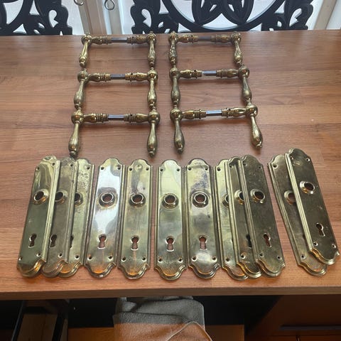 Låset är av äldre modell med utanpåliggande låshus, vred på insidan och oval dörrknopp.