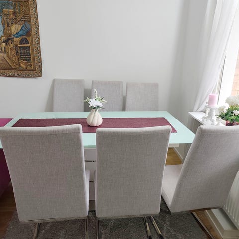 Matbord med rektangulär bordsskiva i glas i mörk ton och vit, massiv fot och 6st stolar.