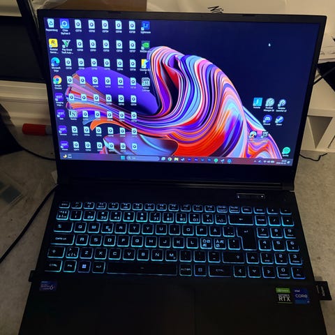 laptop med bakgrundsbelyst tangentbord i flera färger. Skärmen visas med Windows 11 Home installerat. Datorn lämpar sig för allmän användning som arbete, studier och underhållning. Fungerar väldigt bra håller bra temp, spelat lite då och då på den men har stationär just så denna samlar mest damm