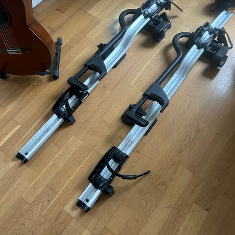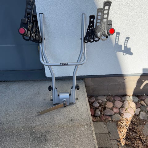Cykelhållare för montering på dragkrok. Stomme i metall i silver med svarta plastdetaljer och hållare för cykelram och hjul. Avsedd för transport av flera cyklar på bilens dragkrok. Passar för personbil med dragkrok och används för säker transport av cyklar vid resor eller vardagskörning.