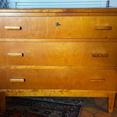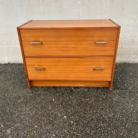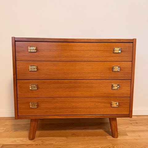 Har en vintage / retro byrå i teak i gott begagnat skick ca 60 år gammal.