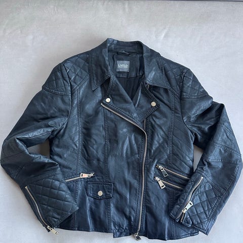 Jacka för dam i storlek XL. Jackan är svart och tillverkad i fuskläder. Modellen har dragkedja framtill och två framfickor med dragkedja. Enkel, kraglösa design med quiltade detaljer vid axlar och nederkant. Passar som ytterplagg vid mildare väder.