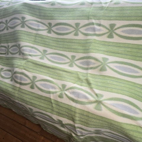 Quiltat draperi i linnetyg. Tyg i flera kvadratiska fält som ger ett diskret, geometriskt mönster.