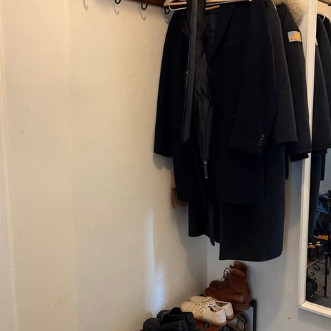 IKEA hemnes hatthylla med galgar och skoställ vit med svarta detaljer