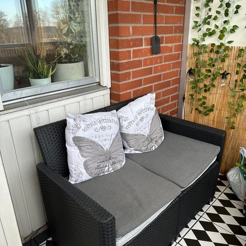 Trädgårdsgrupp i grå konstrotting bestående av två fåtöljer, en tvåsitssoffa och ett rektangulärt bord med glasskiva. Möbelgruppen är avsedd för utomhusbruk, exempelvis på altan, balkong eller uteplats. Inga dynor har alltid stått på inglasad balkong så dom är i fint skick.