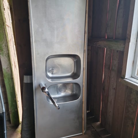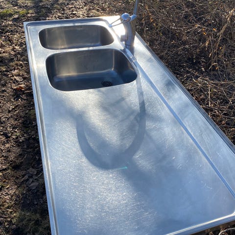 Fristående diskbänk i metall med integrerad ho för exempelvis utekök eller till trädgården. Målarfläckar borstas enkelt bort för att få ny finnish.