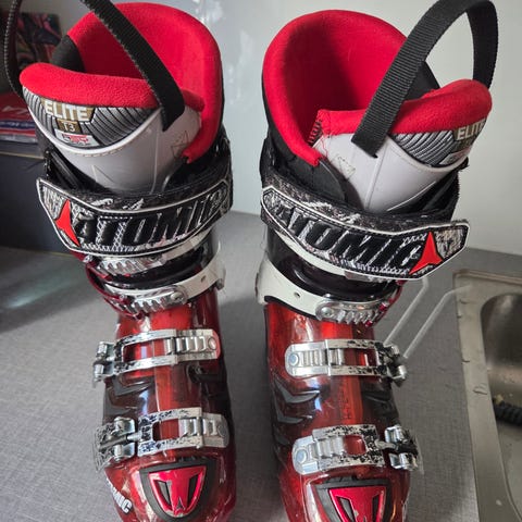 Salomon Falcon Gun alpina pjäxor i storlek 26,5 med sulmått 305 mm. Flex 95. Modellen har genomskinligt grått skal med röda och silverfärgade spännen samt svart och röd ovandel. Fyra mikrojusterbara spännen och kraftigt kardborreband över skaftet ger möjlighet till stabil passform.