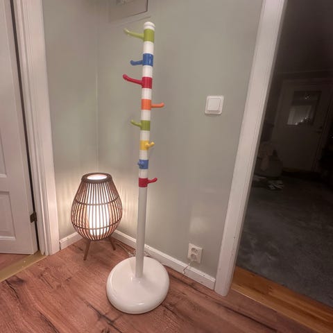 IKEA klädhängare för barn i fristående modell. Stomme och fot i vit färg med flera krokar i olika färger placerade på olika höjder anpassade för barn. Passar för upphängning av ytterkläder, väskor eller accessoarer i barnrum eller hall.
