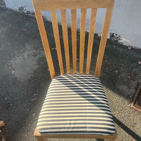 Stolab Carl Malmsten matgrupp med matbord och stolar i ljust trä. Bordet är rektangulärt med utdragsdel som ger extra bordsyta vid behov. Stolarna har träsits med stoppad dyna klädd i randigt tyg i ljusa och mörka toner. Passar som matplats i kök eller vardagsrum. Design av Carl Malmsten för Stolab med fokus på enkel, funktionell form och trädetaljer.