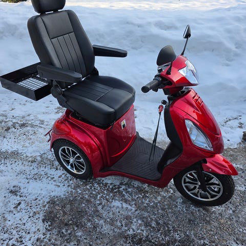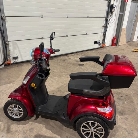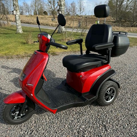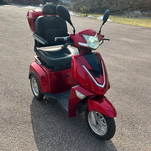 El-scooter, trehjuling, i blå färg. Modellen har tre hjul med låg instegshöjd och fotplatta för bekväm på- och avstigning. Utrustad med hög rygg, nackstöd och armstöd för stabil sittställning. Scootern har backspeglar, belysning fram och bak samt digital display som visar kördata. Använd två gånger.