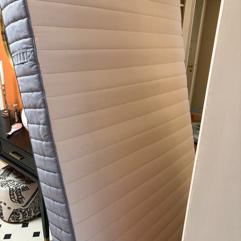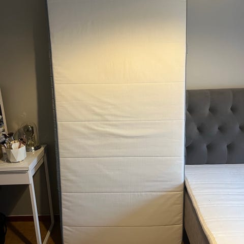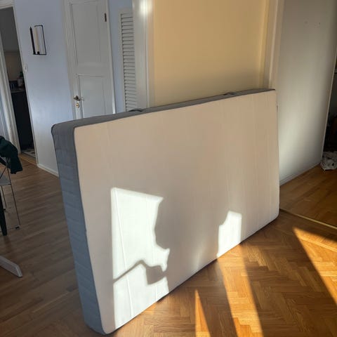 IKEA Espevär resårmadrass i beige och vitt tyg. Madrassen har kviltad ovansida och kontrastfärgad kant runt om. Passar som bas i sängram eller tillsammans med bäddmadrass för extra komfort. Lämplig för användning i sovrum eller gästrum. 105 cm bred. Stått i gästrum, sparsamt använd.