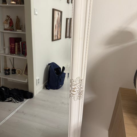 Spegel med vit rektangulär ram. Spegeln har en profilerad ram med diskreta dekorativa detaljer längs kanten. Passar för väggupphängning i exempelvis hall, sovrum eller vardagsrum.