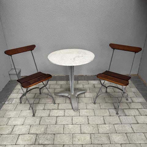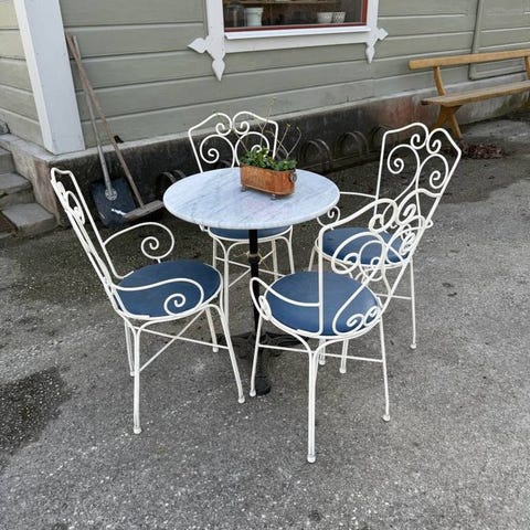Cafégrupp med två stolar och ett runt bord i vitlackerad metall. Möbelgruppen har dekorativt utskurna mönster i sits, ryggstöd och bordsskiva samt svängda ben. Passar för användning på balkong, altan eller i trädgård som mindre sittgrupp för två personer.