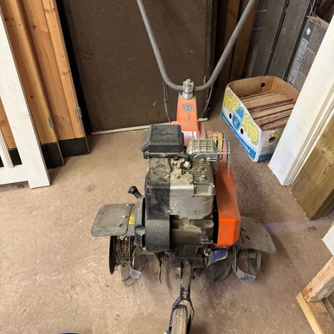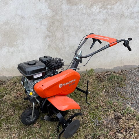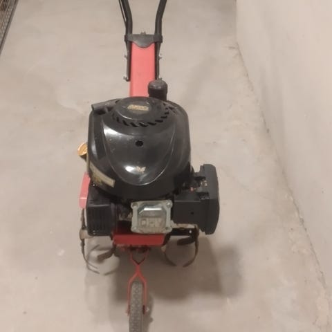 Mantis jordfräs i röd färg med bensinmotor. På bilderna syns flera utbytbara redskap och tillbehör, bland annat olika typer av fräs- och luftningshjul, hjulpar samt skyddsplåt. Maskinen är avsedd för trädgårdsarbete som jordbearbetning, luckring och luftning av mindre odlingsytor och rabatter. Handtag och reglage sitter på ett långt skaft för arbete i stående ställning. Märkt Mantis Europe på handtaget.