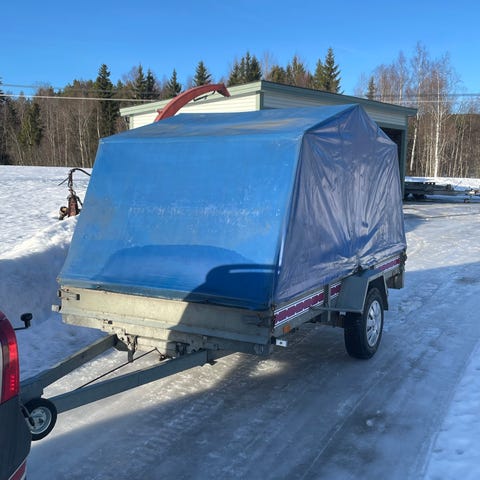 Släpvagn från Arcas med svenska Jaxal kåpa. 350cm flaklängd 150cm flakbredd. Släpet är obromsat med en axel med skruvtipp och bladfjädring för bekväm körning Lämplig för transport av exempelvis snöskoter eller annan utrustning. Skotern på bilden har en 146” matta och har god marginal. Kåpan ger väderskydd och lastytan har slides för skoter samt flertalet lastögglor för säker lastning. Dragkontakten är 13polig och släpet är besiktigat. Sommar och dubbade vinterdäck på fälg ingår