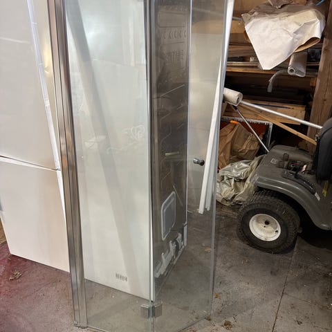 Duschkabin med raka väggar, duschblandare och duschkar i vit plast/komposit 80x80cm, höjd 205cm. Väggarna har släta skivor och dörren i glas, en vägg är utrustad med stång och handdusch samt blandare, Oras. Duschkaret är fyrkantigt med avlopp placerat i ett hörn. Passar för installation i badrum eller gästtoalett där en kompakt duschlösning önskas.