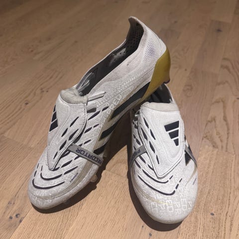Adidas Predator fotbollsskor i vitt med blå detaljer. Skorna har dobbar anpassade för spel på gräs eller konstgräs. Överdelen är i syntetmaterial med täckande plös över snörningen för jämnare bollträff. Storlek