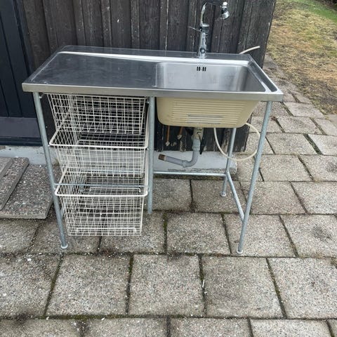 Rostfri diskbänk med integrerad ho ( i ett stycke, ej skarvar) och fin Mora blandare. Diskbänken står på benstativ i metall med underhylla i galler för förvaring. Utrustad med en fin Mora-blandare. Under ho finns avloppsanslutning och rördragning med ballofixer för vatten. Sitter även en ögondusch monterad, men det går att skruva bort om man inte vill ha den.