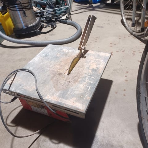 Einhell RT-SC 570 L kakelsåg med stativ. Stationär såg för kapning av kakel och klinker med längdanhåll och vinkelinställning. Sågen är monterad på ett metallstativ med arbetsbord. Maskinen har vattenkylning av klingan och levereras med flera sågklingor enligt bild. Lämplig för kapning av plattor eller tegel vid renovering och byggprojekt.