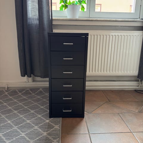 Lådhurtsar från IKEA med lås till skrivbord i industrilackad bok