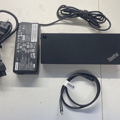 Lenovo ThinkPad USB-C Dock datorstation. Dockningsstation för dator med flera anslutningar, bland annat USB-portar, nätverksport (Ethernet) och bildskärmsutgångar. Ansluts via USB-C till kompatibel dator för att ge extra portar för kringutrustning som skärm, tangentbord, mus och nätverk.