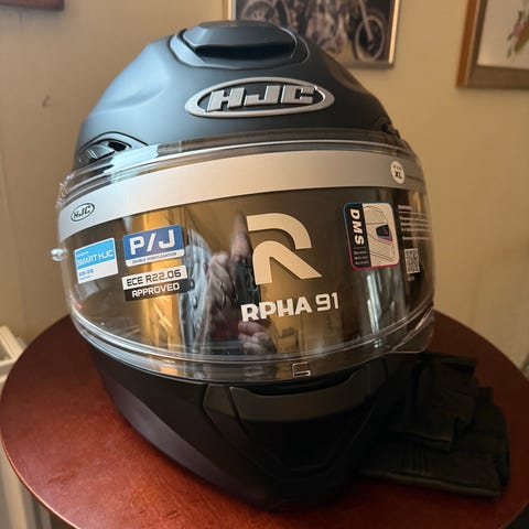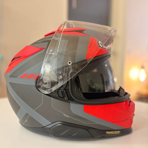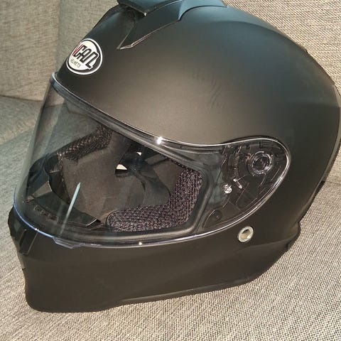 En gul integral hjälm med mörkt visir och pinlock lins. NEXX kommunikationssystem monterat. Det finns ett klart visir på sidan om. Inga skador. Mycket fint skick.