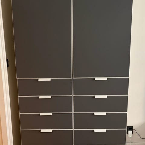 Garderob 2 stycken 120 och 180 höga, 9 lådor och hyllplan och hängskena i högra delen.