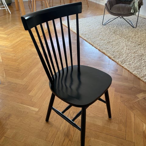 Två svarta stolar i trä. I fint skick men enstaka slitage, se bild.