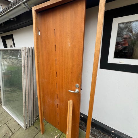 Gedigen innerdörr med frostat glas och träram i ek. Dörren har ett större glasparti i mitten som släpper igenom ljus men ger insynsskydd. Ramen är i trä med synlig trästruktur. Passar exempelvis som dörr mellan hall och badrum eller andra rum där man vill kombinera ljusinsläpp och avskildhet.