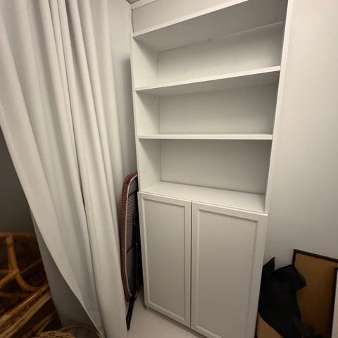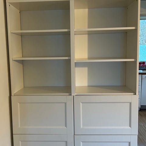 Hylla med två dörrar i okej skick. Tre synliga hyllplan och två hyllplan bakom dörrarna.
