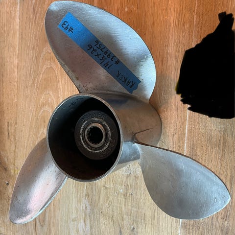 Ballistic rostfri propeller med tre blad och medföljande navinsats. Propellern är i metall med polerad yta. Navinsatsen är splinesförsedd och anpassad för montering på propelleraxel. Lämplig som propeller till utombordare eller drev där denna typ av Ballistic-propeller och nav passar enligt tillverkarens specifikationer.
