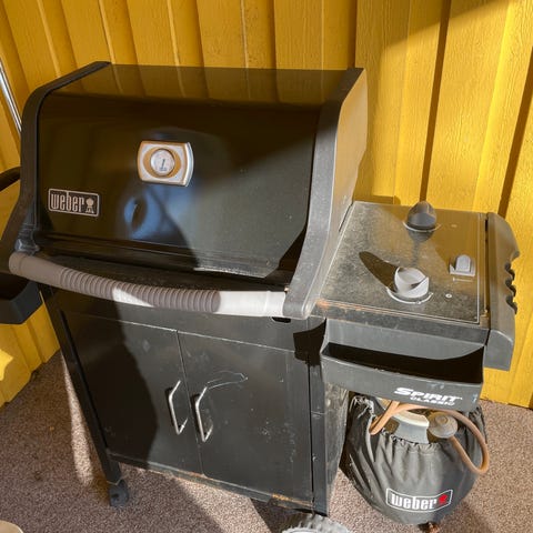 Weber Q gasolgrill i svart utförande. Grillen har lock med inbyggd termometer, två sidobord, underrede med hjul samt anslutning för gasol. Grillgaller och insida av locket visar spår av användning. Passar för utomhusgrillning på exempelvis altan eller uteplats. OBS gasoltub följer ej med.