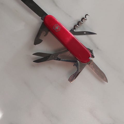 Kniv, buköppnare, korkskruv.