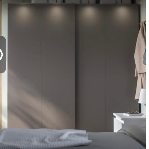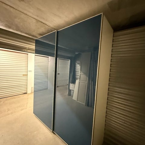 Garderob i gott skick, stilren och med snygg inredning. En liten list har lossnat invändigt, men inget som stör funktion. I övrigt fin! Praktisk med vita, diskreta skjutdörrar, inte skrymmande. Slukar mycket!