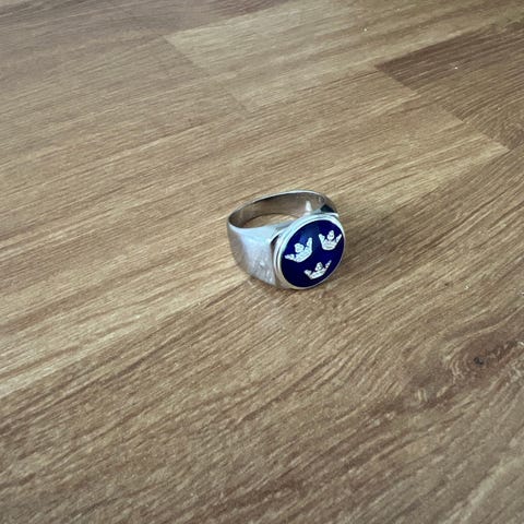 Baksidan är stämplad med "STERLING" och har en klämma, vilket gör den lämplig som sedelklämma. Tillverkad 1979.