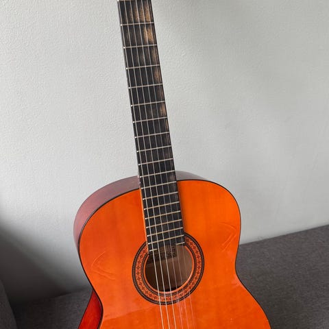 Akustisk gitarr i klassisk modell+ställ. Gitarren har nylonsträngar och hel hals med bandmarkeringar. Kroppen har naturfärgad topp och mörkare sidor och baksida. Passar för spel i hemmet, övning och enklare framträdanden inom klassisk musik, visor och liknande stilar.